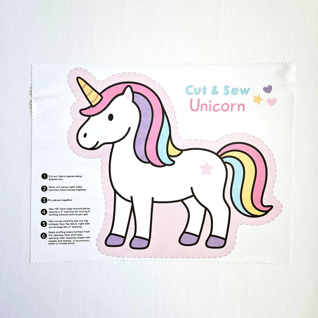 This Cut & Sew Unicorn Plush Panel makes crafting easy and fun for all ages. Simply cut along the dashed lines, stitch the pieces together, and stuff to create a cuddly rainbow unicorn plush. Perfect for kids learning to sew, creative adults, or anyone who loves handmade gifts. Your finished unicorn will measure approximately 12"x11".