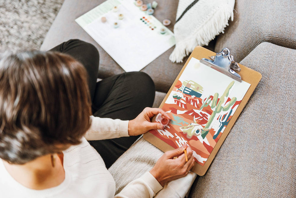 “Desertscape” features a vintage camper in a desolate desert landscape with cacti. The pre-printed background features a clear sky. Completing the painting can take between 6-8 hours. Recommended for ages 13 and up.
