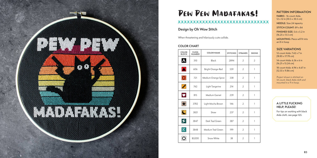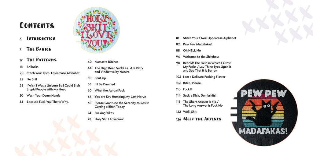 No previous experience is required. In addition to simple instructions and clear, easy-to-follow patterns, the book includes a guide to basic lesson in cross-stitch techniques, so anyone can start swearin’ and stabbin’ right away.