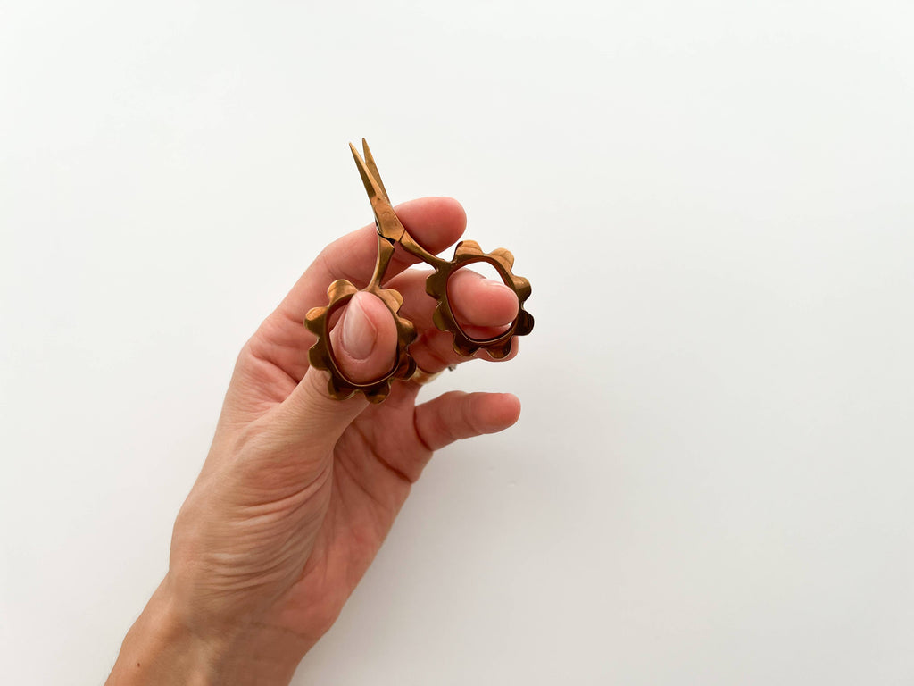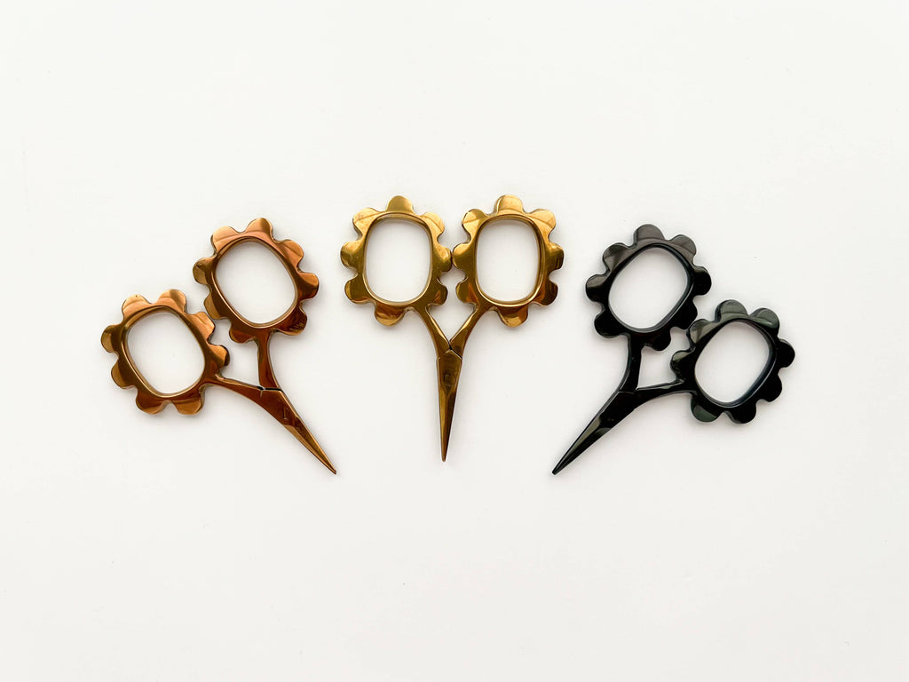 Adorable tiny flower scissors for various needlework uses such as: hand embroidery, cross stitch, sewing, crochet, quilting, knitting, and more. Available in colors: - gold - copper - black Their darling, modern design will make this pair of scissors a great addition to any maker’s collection. These tiny flower snips feature short blades ideal for cutting thread and measure just 2.5 inches.